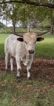 Off white with color coming in on hide. Color creeping up on legs and feet. Terrific body and great horn development at an early age!
